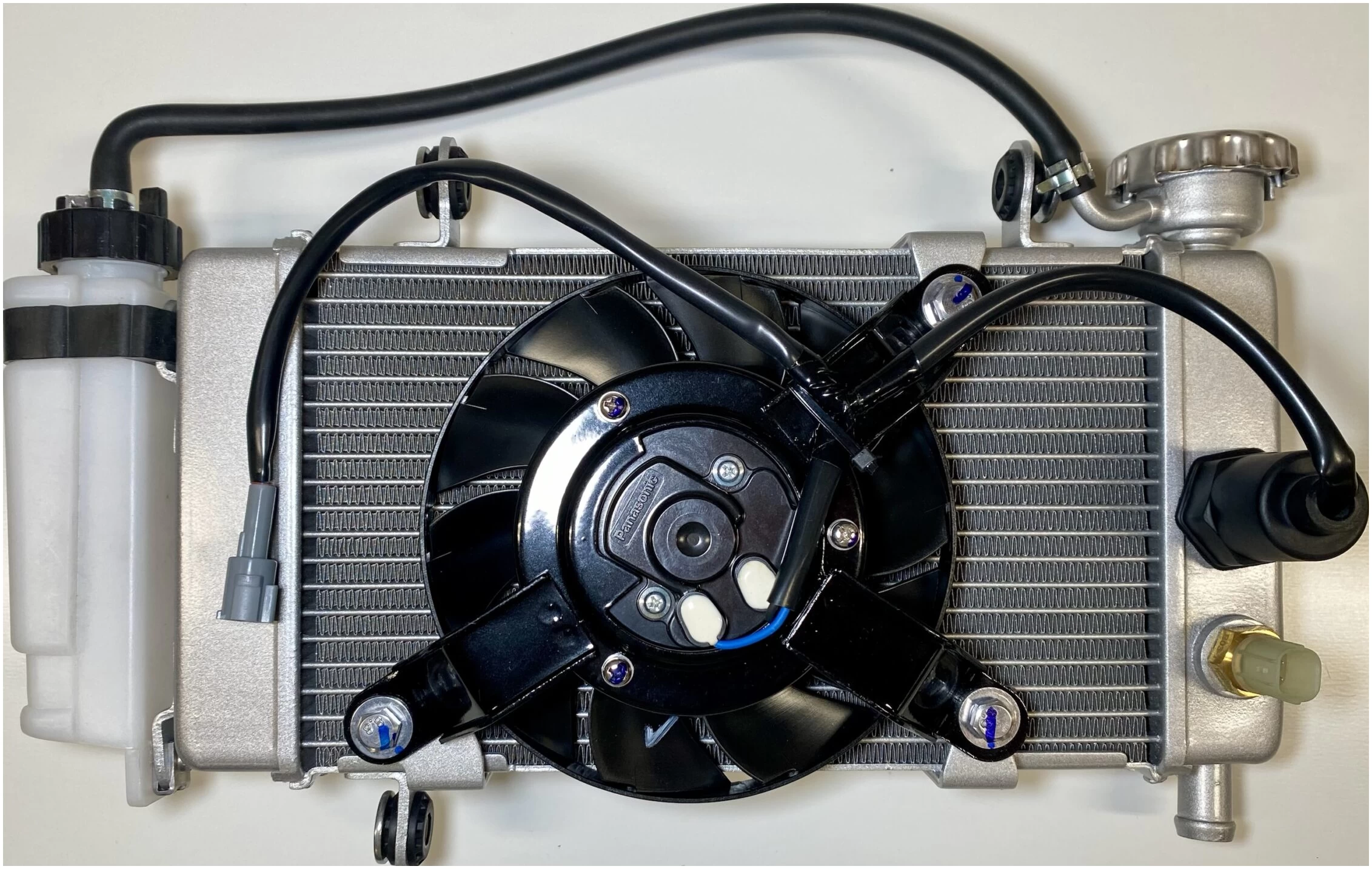 В сборе с крышкой, вентилятором, расширительным бачком, датчиком температуры и датчиком включения вентилятора.